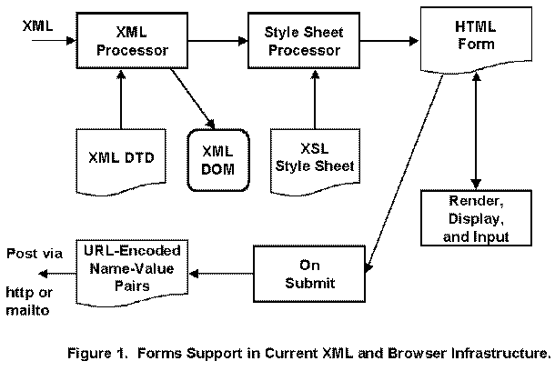 HTML Forms are one of the more widely used features of HTML. In reviewing XML, XSL and related standards, there doesn't seem to be much specific XML support for forms. The XFDL (Extensible Forms Definition Language) proposal creates a specific XML-based language for defining forms, rather than providing generic XML form and signature features. Thus, it requires a XFDL-aware client application or plug-in at the browser to present, fill, sign and submit the XFDL forms.