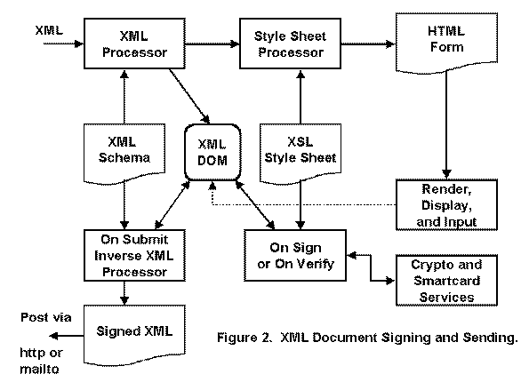 Figure 2 shows a possible approach to signing and submitting XML documents. The first part, that produces an HTML Form proceeds as before with the exception that the HTML <BUTTON> now has two new standard types: "Sign" and "Verify". The sign buttons also contains a list of Xpointers which identify the elements in the input XML document and the XSL style sheet that are to be signed. These are hashed independently, and then their hashes signed using the FSML approach. The verify button contains an Xpointer to the <signature> element in the XML document which is to be verified.