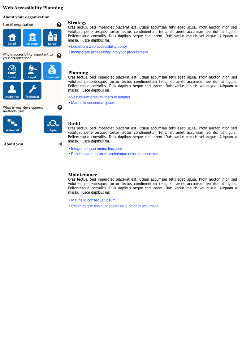 Complete tool: Questions become filters presented to allow users to reduce the information presented to that which is of interest. That than group by topic, group by general project stage. This shows some filters selected.