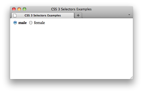 <body> <form> <input type="radio" id="m" name="gender" value="male"> <label for="m">male</label> <input type="radio" id="f" name="gender" value="female"> <label for="f">female</label> </form> </body>
